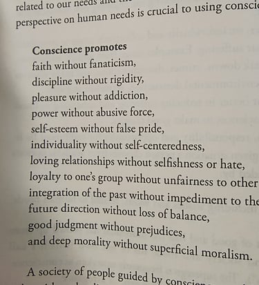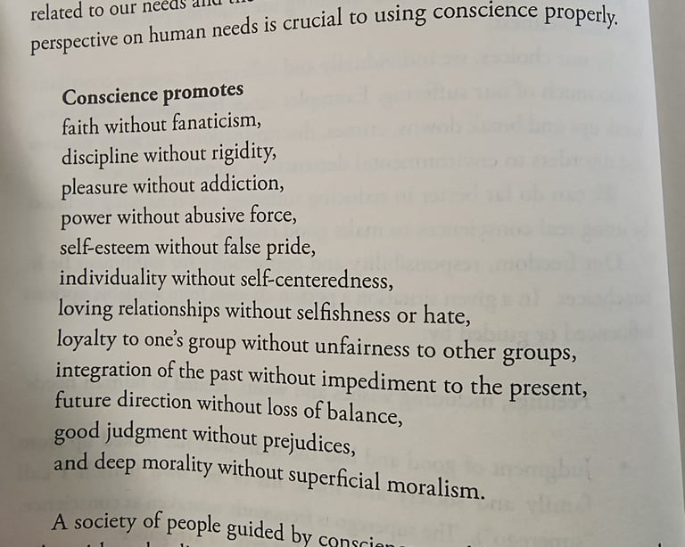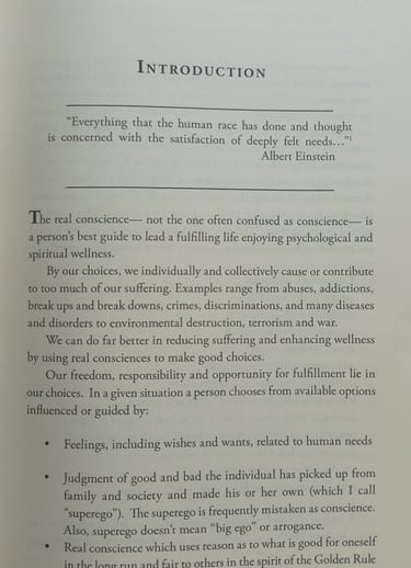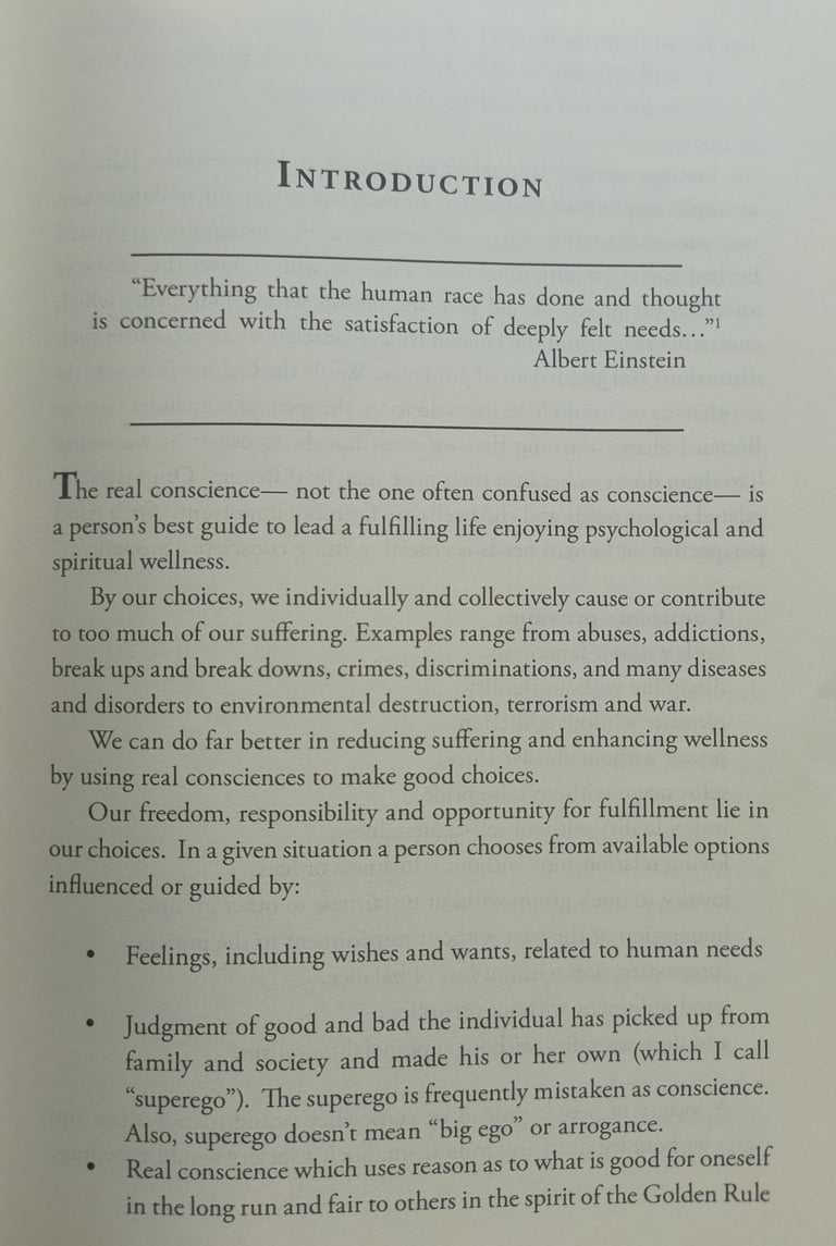 The book explains how to fulfill human needs using one's real conscience which applies reason and the Golden Rule in making choices. Also, the book shows the problems caused by contradicting conscience either being pushed by excessive feelings or misguided by social programming.